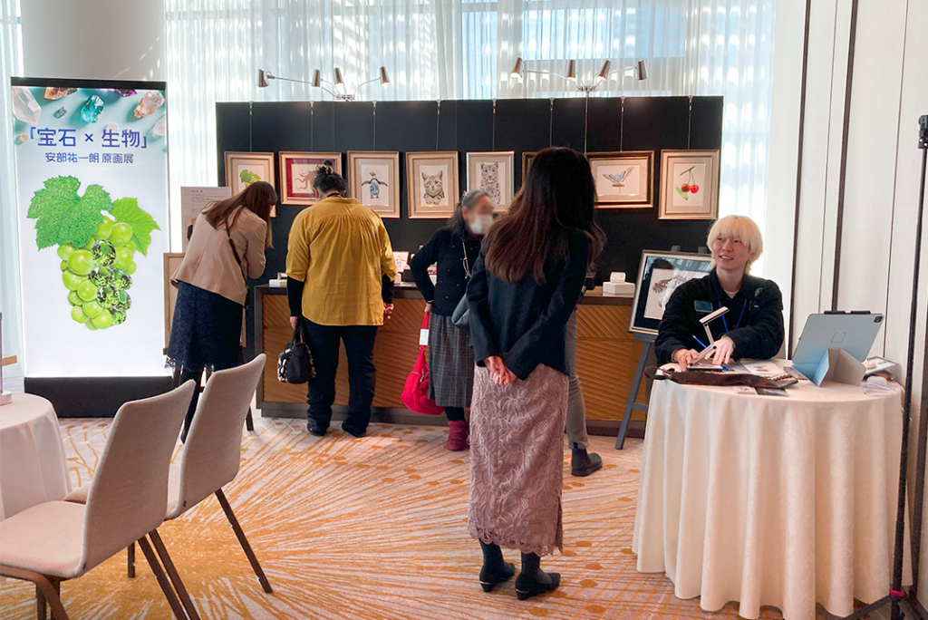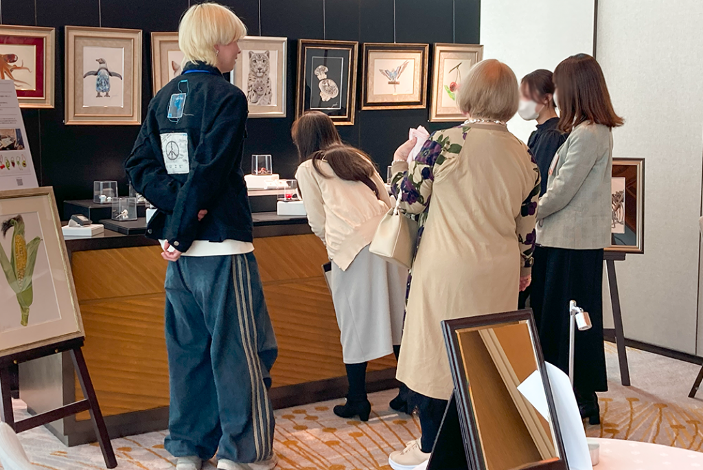 ホワイエでは、「宝石×生物」の原画を展示いたしました。誰もが使ったことのある色鉛筆で作り上げる、繊細で美しい芸術作品を目の前でお客様に楽しんでいただきました。